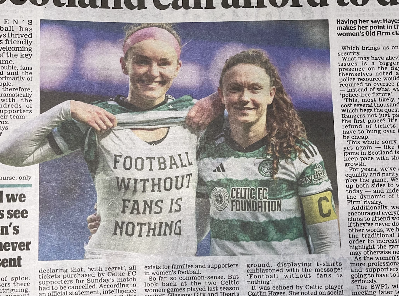 Celtic player Caitlin Hayes displayed a t-shirt at the end of the match saying “Football without fans is nothing” and the whole squad celebrated the irresponsible breaking of the ban by a handful of Celtic fans by congratulating them at the end of the game. Knowingly, or unknowingly, it was a supremely hypocritical act – it’s was Celtic’s own decision to ban all away fans. They had choice to take on their own risk fans and they bottled it.